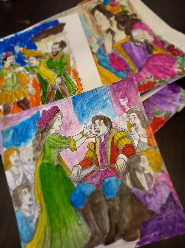 Last night as I was scrolling through Pinterest, hoping inspiration would hit, I had a truly Gen Z epiphany. I couldn’t find what I was looking for, so I turned to Bing Image Generator and ai’d my way to custom “Taming of the Shrew Coloring Pages”. We painted them in class today as we read aloud and I have to say it was a winning combo. The fact that the coloring pages are ridiculous and sport extra arms and legs only makes them more awesome.