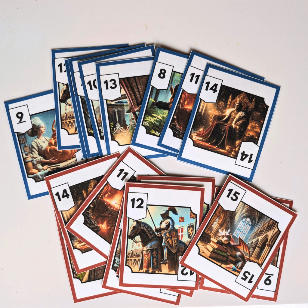 Soooo, thanks to the power of the internet and a little late-night insomnia, here are some personified number cards for all your little creative math geniuses (or right-brained ADHD-prone kids). If you want four suites like regular playing cards, print two sets. (make sure you select “fit to page” otherwise your printer will chop off the color). You can make blue cards negative numbers and red cards positive numbers…you can add the red and minus the blues…or multiply and divide. The sky is the limit! (I included a whole list of quick, fast medieval-themed math games that will tempt even the most dysgraphic sensitive kid into doing math…perhaps even liking it)